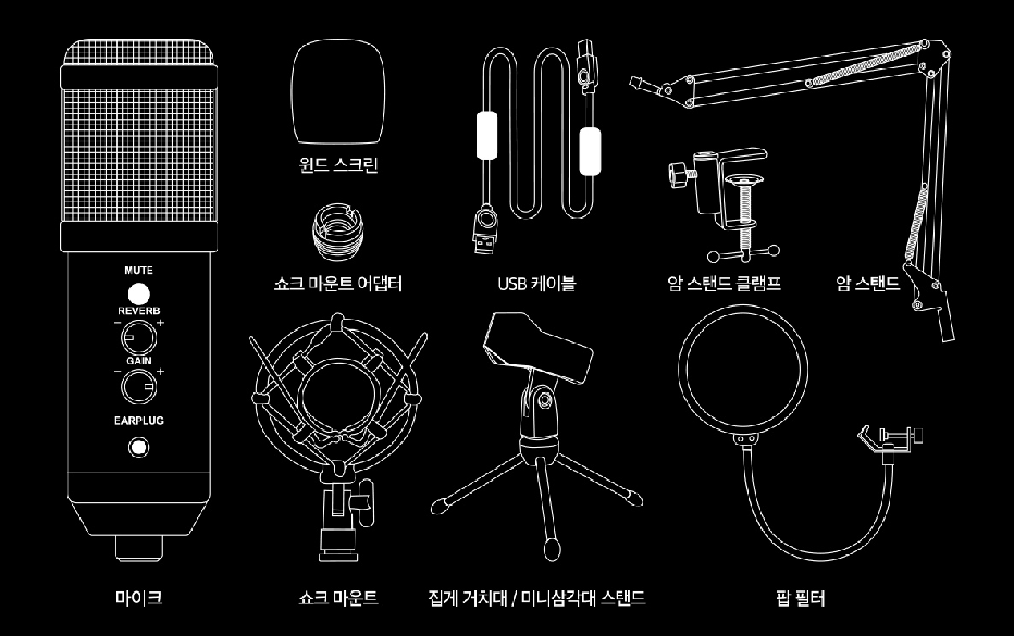 마이크부터 암 스탠드까지 모든 구성품이 포함되어 있습니다